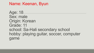 Keenan is an 18-year-old Korean male who recently immigrated to Canada with his mother and sister to live with his aunt. He enjoys playing guitar, soccer, and computer games in his free time. At his new high school, he is taking ESL, pre-calculus, and art classes but wants to enroll in more English courses to prepare for college. On weekends, he likes to go to church and spend time with his family and pets.
