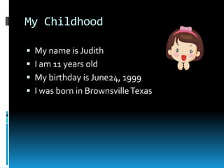 Judith is an 11-year-old girl from Brownsville, Texas. She describes her family, which includes her mom, dad, two sisters and a brother. Her best friends are Marbel and Samantha, and she enjoys various sports like volleyball and kickball. Some of her favorite things are the color baby blue, the movie Game Plan, pizza, and going to Golden Corral. She likes being with friends at school but dislikes tests and homework. In her free time, Judith enjoys playing, going to the park, watching TV and listening to music.