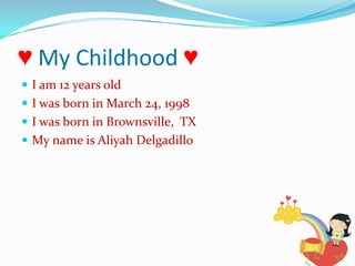 Aliyah Delgadillo is a 12-year-old girl from Brownsville, Texas who created an "All About Me" document describing her family, interests, favorites, and more. She enjoys sports like swimming, football, and basketball and school subjects like art, choir, and band. Her favorite foods include pizza, hamburgers, and enchiladas. In her free time, she likes watching movies, going to the park and mall, and visiting her grandfather's house.