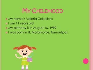 Valeria Caballero is an 11-year-old girl who wrote an essay about herself. She discusses her favorite foods like homemade waffles, baked potatoes, and pizza. She has two pet rats named Chiquis and Pequis. Her family includes her parents, sister, and brother. She enjoys science class and dancing. In her free time, she reads, plays with her dogs, and jumps on her trampoline. She is quiet in school but energetic at home. Her favorite holidays are Christmas and New Year's. Some of her favorite movies are the first three Harry Potter films and Toy Story. Her favorite game is Monopoly that she plays with her family. Her favorite sports are soccer and tennis.