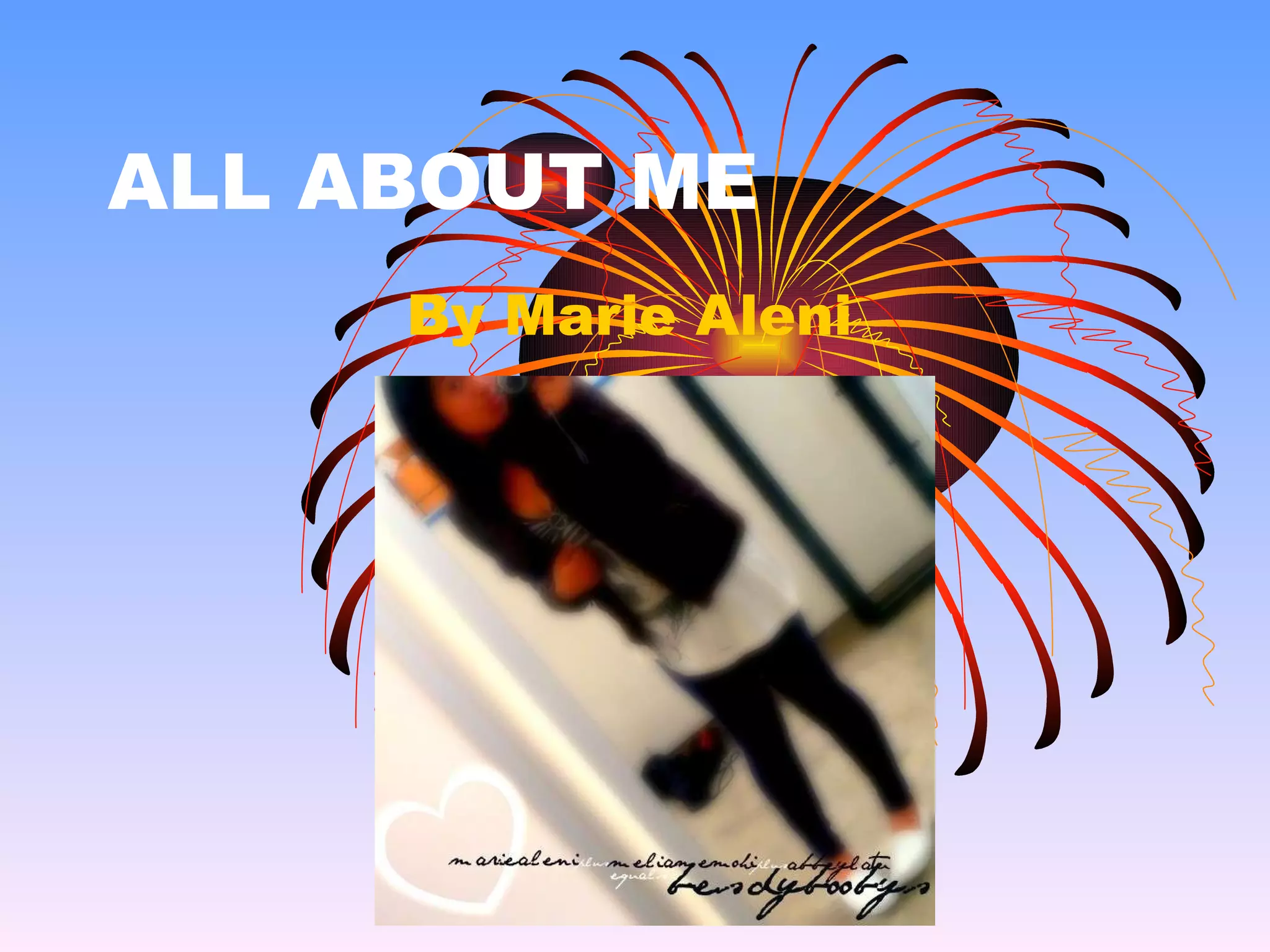 Marie provides a list of personal details about her friends, favorite foods, schools attended, star sign, art interests, computer programs, TV shows, activities, hobbies, favorite movie, singers, music genres and video in her document titled "ALL ABOUT ME". The document contains a list of Marie's friends, schools, favorite foods, art interests, computer programs, TV shows, activities, hobbies, favorite singers and music genres.