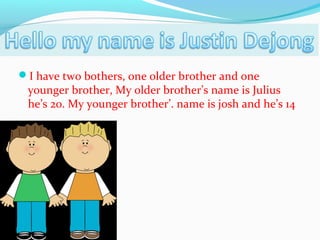 Justin has two brothers, an older brother named Julius who is 20 and a younger brother named Josh who is 14. His favorite sports are basketball, volleyball, baseball, and soccer. He enjoys playing League of Legends and traveling to meet new people in different countries. His favorite season is summer and animal is the cheetah.