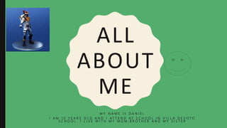 Daniel is a 10-year-old boy who lives in Villa de Voto, Argentina with his mother, brother, and sister. He attends school and enjoys playing video games, football, and watching TV at his house, which he considers his favorite place. Daniel's favorite sport is football, which he plays five times a week with friends, and his favorite food is pasta, especially spaghetti.