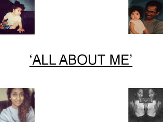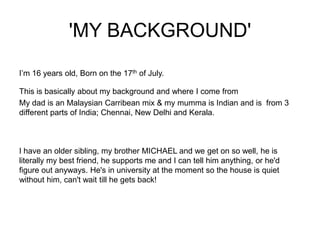 The document provides background information about the author. It states that the author is 16 years old, with their father being Malaysian Caribbean and their mother being Indian. They have an older brother named Michael who they are very close with. The author enjoys music, photography, and thinking about civil, social, and human rights issues. They find music soothing and a way to lose themselves. Photography is a passion they enjoy in their free time, often taking photos during hiking trips.