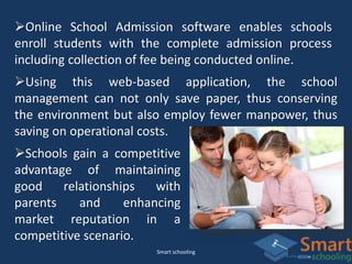 The document discusses online school admission software by Smart Schooling, which streamlines the entire admission process, allowing for online fee collection and efficient data management. It highlights benefits such as reduced environmental impact, lower operational costs, and improved communication with parents. The software also enhances accuracy and transparency, helping schools to stay competitive and organized while making the admission process more convenient for families.
