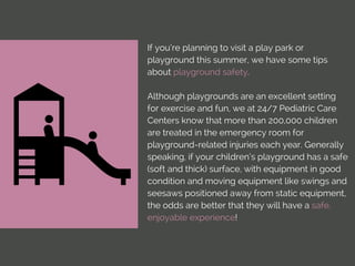 The document provides essential tips for ensuring playground safety to prevent injuries, highlighting the importance of supervision, appropriate equipment for children's ages, and safety practices while playing. It emphasizes the need for safe surfaces, monitoring equipment like swings and slides, and restricting certain unsafe playground gear. Parents are encouraged to enforce park rules and ensure children wear non-skid shoes to minimize the risk of accidents.