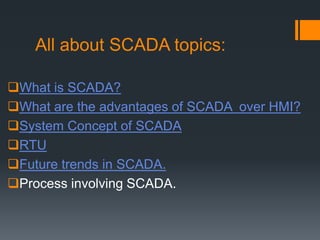 This document provides information about SCADA (Supervisory Control and Data Acquisition) systems. It discusses what SCADA is, the advantages of SCADA over HMI, the system concept of SCADA including RTUs, and future trends in SCADA. Specific topics covered include the history and purpose of SCADA, where SCADA is used, alarm features in SCADA, and applications of RTUs in remote monitoring and control.