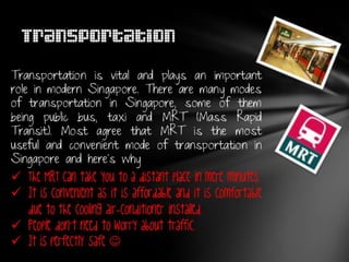 This document provides information about Singapore, including when to visit, facts about the country, education system, neighborhoods, attractions, and festivals. Some key points are: