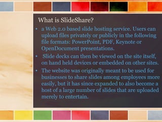 SlideShare is a website launched in 2006 that allows users to upload and share presentations publicly or privately in formats like PowerPoint, PDF and Keynote. Uploaded presentations can be viewed on the site or embedded elsewhere. While originally intended for businesses to share internally, SlideShare has expanded to host a wide variety of presentations for entertainment as well. Users can upload, download, embed and share presentations, and use features like Leadshare to generate business leads or Slidecast to create webinars.
