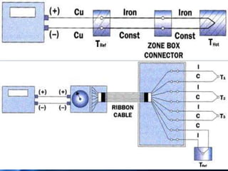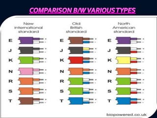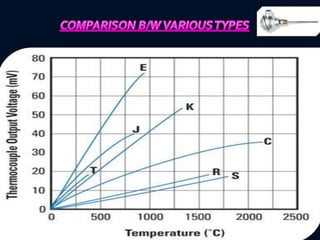 The document discusses thermocouples, which are devices that measure temperature based on the principle that a voltage is generated at the junction of two dissimilar metals when exposed to different temperatures. It outlines the types of thermocouples (such as types K, J, E, N, M, and S) based on their metal compositions and temperature ranges, as well as the governing principles like the Seebeck, Peltier, and Thomson effects. Additionally, it highlights construction types, applications, advantages, and disadvantages of thermocouples.