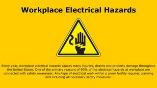 The document discusses workplace electrical safety, highlighting the significant risks and statistics surrounding electrical hazards, which result in over 300 deaths and 4,000 injuries annually in the U.S. It emphasizes the importance of safety awareness, proper equipment, and maintenance, along with adherence to safety standards such as NFPA 70E and OSHA regulations to mitigate these hazards. Current Solutions PC offers a comprehensive training program to educate employees on electrical safety practices.