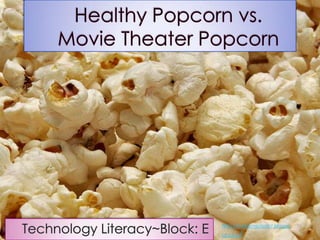 Movie theater popcorn is high in calories and saturated fat since it uses unhealthy oils rather than real butter, while healthy homemade popcorn has vitamins, fiber, and fewer calories. The document encourages making good nutrition habits from a young age by choosing air-popped popcorn over movie theater popcorn for health reasons. It provides tips on proper portion sizes of foods and recommends popcorn as a healthy snack option.