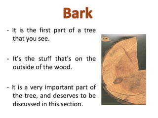3. Bark has important structural, protective and transport functions and can be used to identify tree species. Different barks have distinct characteristics and chemical compositions that determine their uses.