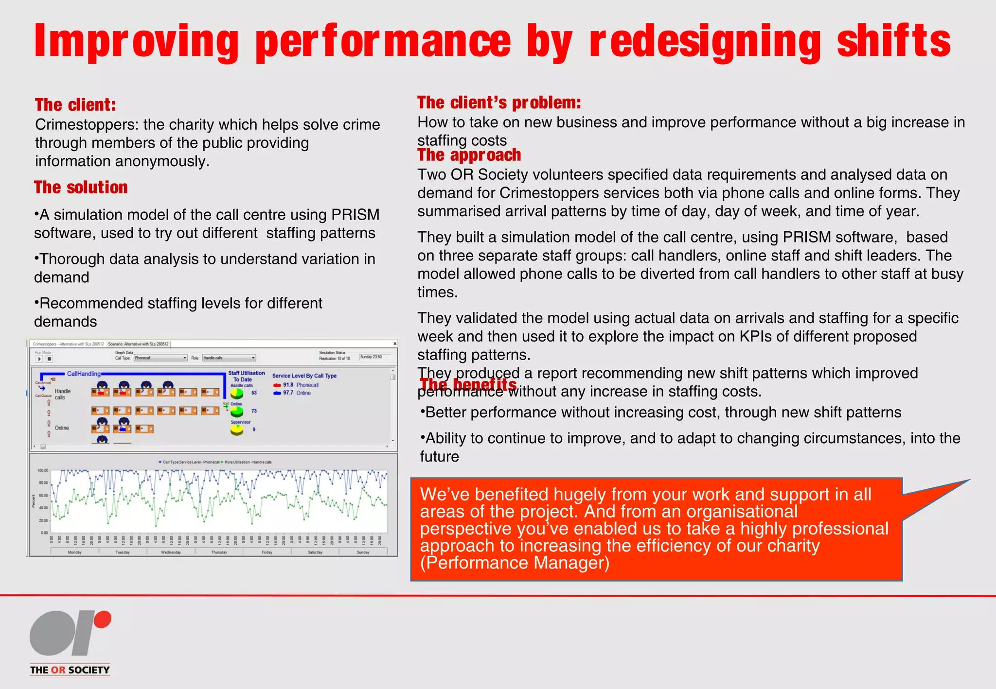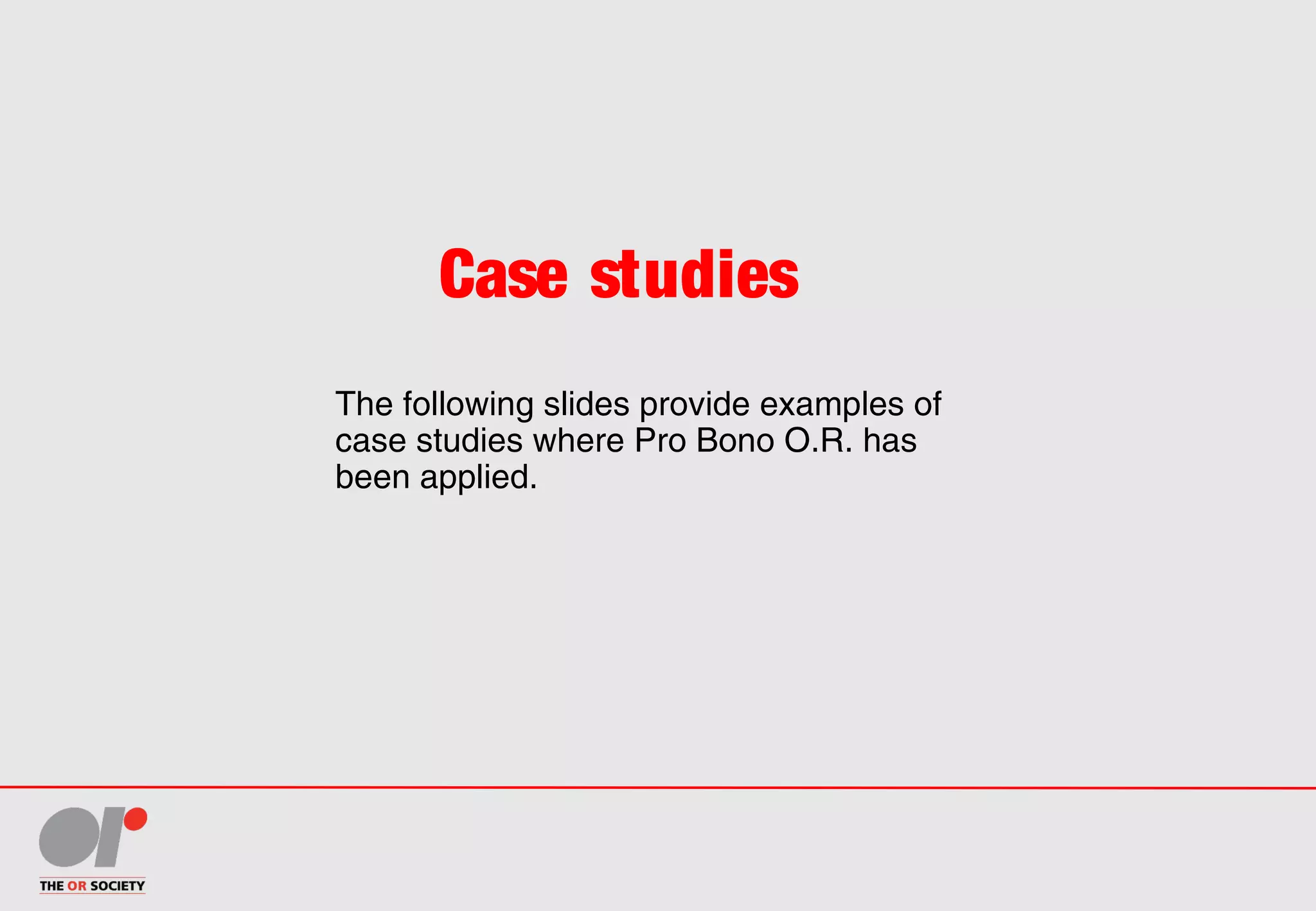 The document provides examples of case studies where Pro Bono O.R. has been applied. The first case study describes how volunteers analyzed data and built a simulation model to recommend new staff shift patterns for a crimestoppers call center, improving performance without increasing costs. The second case study discusses how volunteers identified process improvements and value-adding activities for a charity matching volunteers to organizations. The third case study outlines how volunteers helped a youth venture define risks to sustainability and create a risk management plan.