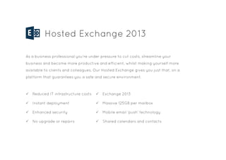 This document summarizes and promotes several cloud services offered by the company, including Hosted Exchange 2013 for email hosting, Email Security services, Hosted Acronis Backup Cloud for data backup, Hosted SharePoint for document sharing and collaboration, and Office 365 subscriptions. These services are presented as solutions to cut costs while improving productivity, communications, security and data protection for businesses.