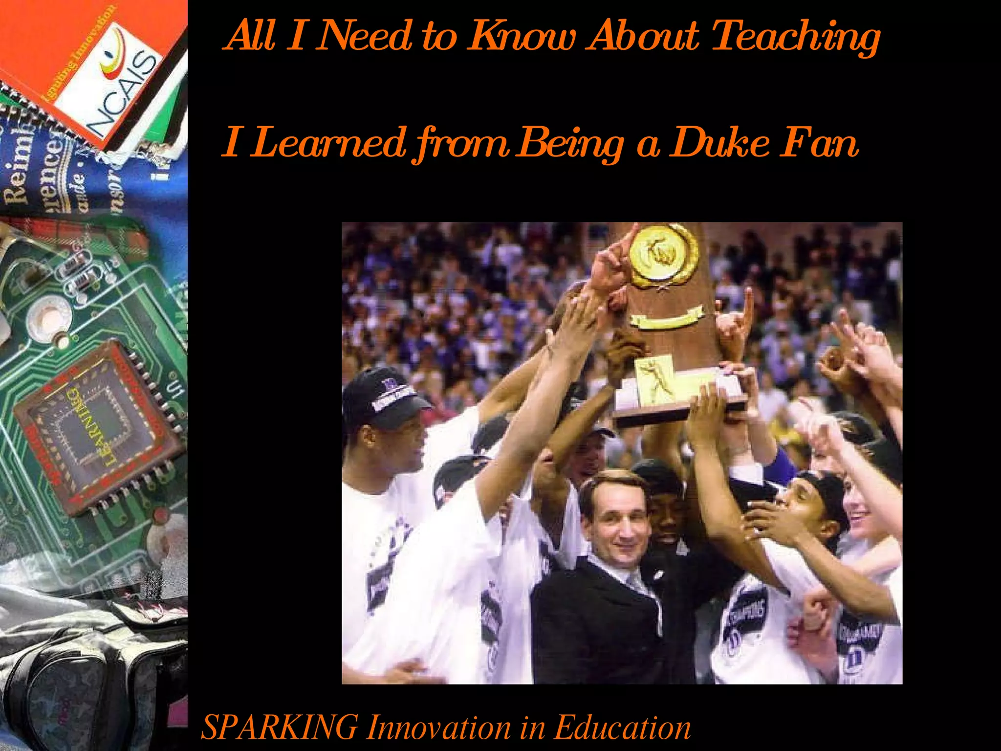Being a fan of Duke basketball taught the author valuable lessons that can be applied to teaching. As a fan, they learned patience when the team struggled and celebrated small victories along the way. Most importantly, they saw how a coach motivated and inspired players to achieve more than they thought possible, showing the importance of an educator empowering students.