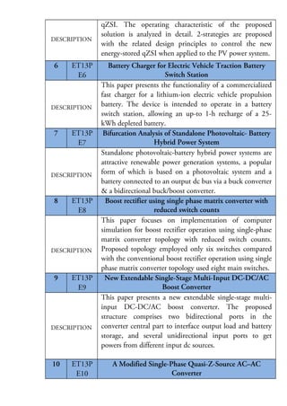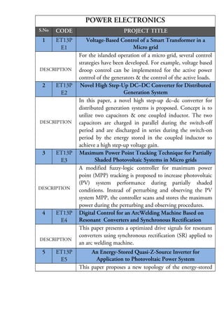The document discusses 20 projects related to power electronics, power systems, and power sectors. The projects focus on various topics including voltage control in microgrids, DC-DC converters, maximum power point tracking for photovoltaic systems, welding machine control, inverters, battery charging, and more. Control strategies, topologies, and applications across these areas are explored.
