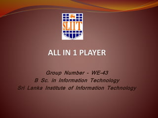 Group WE-43 presented their mobile application called All in 1 Player. The application allows users to watch and stream videos online from YouTube, download YouTube videos into MP3 format, play songs from their device memory, and includes voice recognition functionality. It aims to provide media playback capabilities that are not all together in existing Android media players. The document discusses similar existing media player applications and their capabilities and limitations. It also outlines the software, hardware, and other requirements to develop the All in 1 Player application, including using Android Studio and Java, and supporting Android KitKat and newer versions.