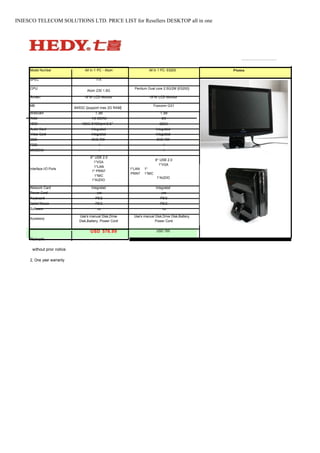 This document provides a price list for two all-in-one desktop models from INIESCO TELECOM SOLUTIONS LTD. for resellers. The first model is an Atom-based system for $576.99 featuring a 1.6GHz Atom CPU, 1GB RAM, 160GB HDD, and integrated graphics. The second model is an E5200-based system for $765 featuring a 2.5GHz Pentium dual-core CPU, 2GB RAM, 250GB HDD, and integrated graphics. Both models include a 19-inch LCD monitor, DVD-RW drive, and standard ports and accessories.