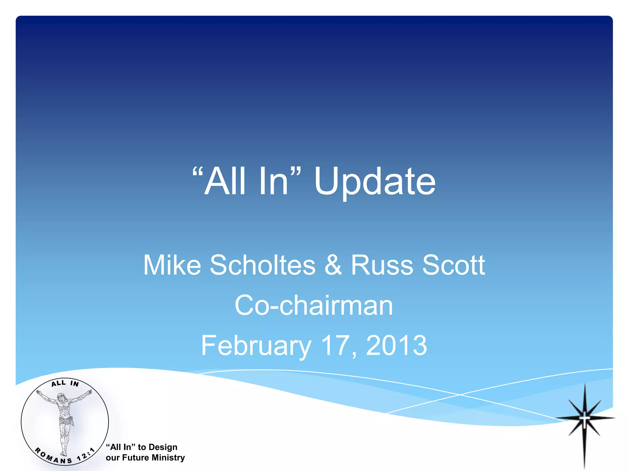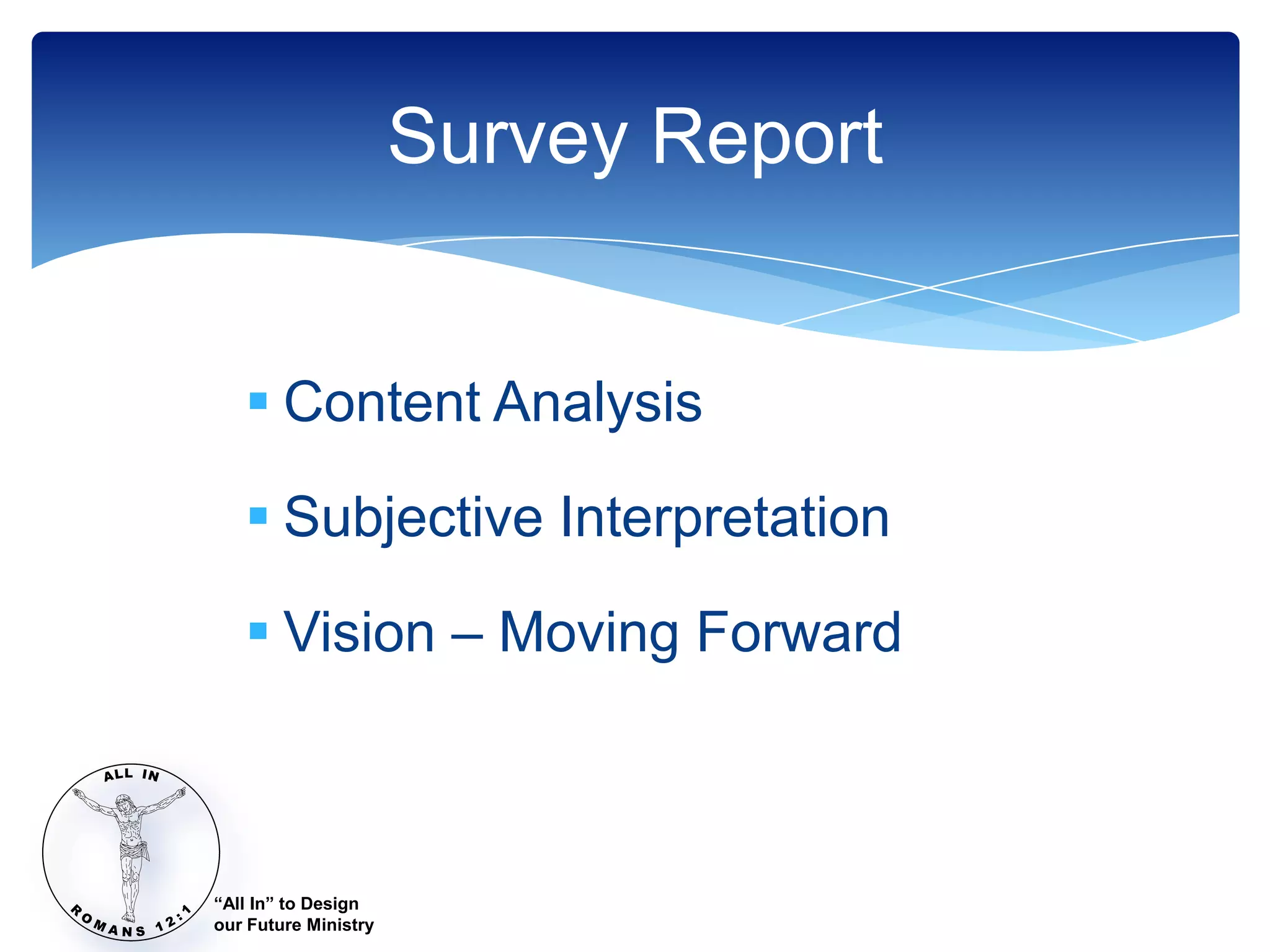 The document presents a report on the 'All In' ministry survey conducted by Mike Scholtes and Russ Scott, highlighting demographics, and areas of opportunity and challenge within the church, including engagement with the congregation, worship services, and community outreach. Key findings indicate an overall positive perception among active members, with emphasis on enhancing youth ministry and leveraging time and talent for community and engagement initiatives. Future steps include addressing feedback with the board, conducting a gap analysis, and sharing updates through newsletters.