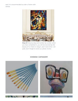The document provides instructions for painting by numbers kits. It explains that no painting experience is required and kits include all necessary supplies. It outlines the three main steps: 1) Order a kit with numbered canvas and paints, 2) Stretch the canvas and start painting number by number using the provided brushes and colors, 3) Complete the painting and optionally frame it. Tips are given such as starting at the top and washing brushes between colors. A variety of kit themes and products are displayed.
