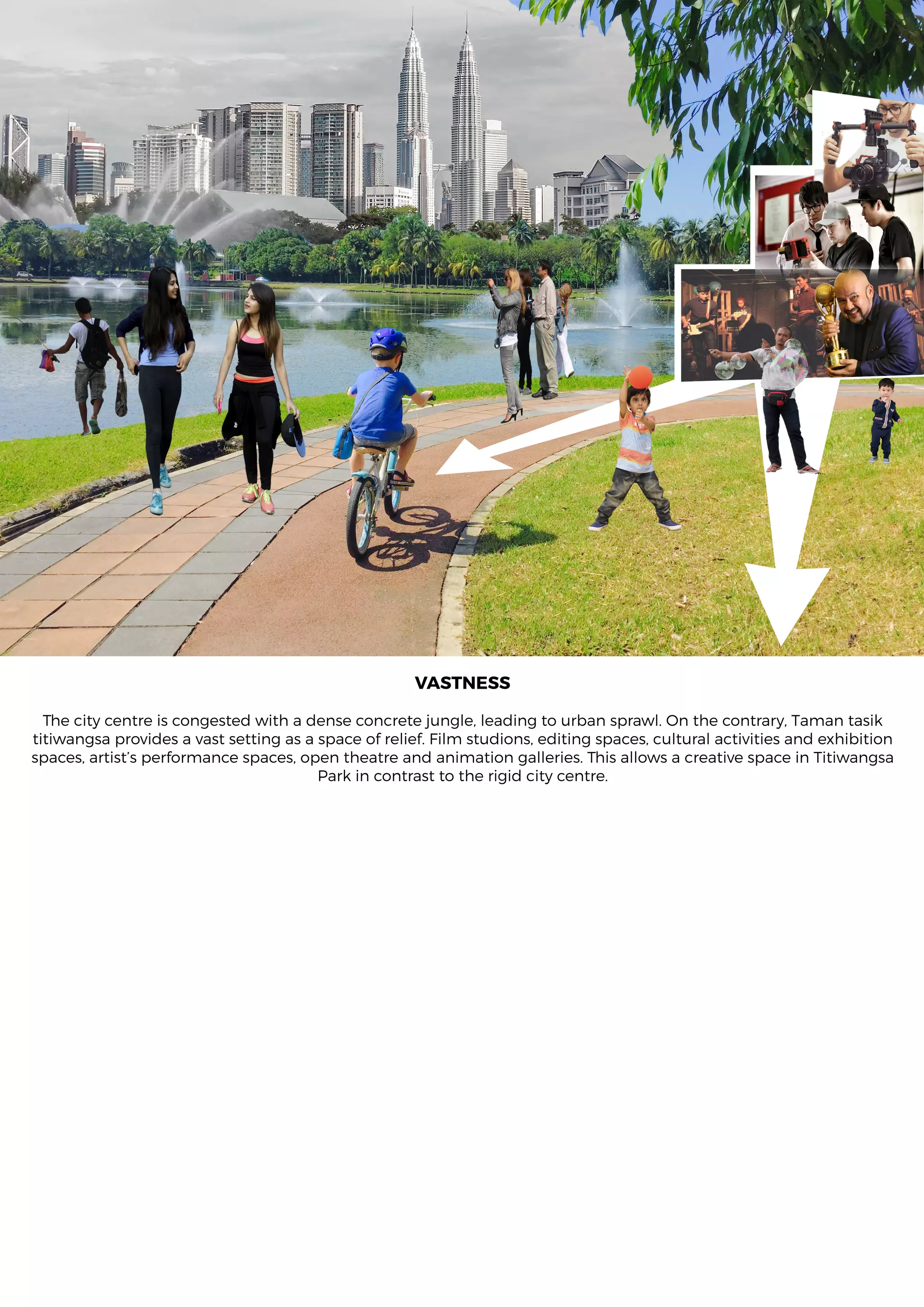 The document summarizes the design of a proposed creative space in Titiwangsa Park, Kuala Lumpur. It describes the site and surrounding context, including the dense urban center nearby and the vast open space of the park. It then outlines proposed spaces and activities for the building, such as exhibition spaces, performance spaces, editing rooms, and more. Diagrams show how the building could engage with and capture views of the surrounding park. The building aims to provide a creative hub that promotes activity and connections between the park and surrounding communities.