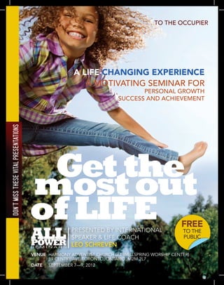 This document advertises a 3-day motivational seminar presented by international speaker Leo Schreven on personal growth, success, and achievement. The seminar will take place from September 7-9, 2012 at the Harmony Adventist Church in Toronto, Ontario. It will consist of 15 sessions over the 3 days covering topics such as harnessing motivational forces, changing habits, goal setting, health, wealth creation, and overcoming fear. The seminar is presented for free to the public and is aimed at helping attendees experience success in all areas of their lives through Leo Schreven's principles and practical insights. Childcare will also be provided for up to 50 children during the event.