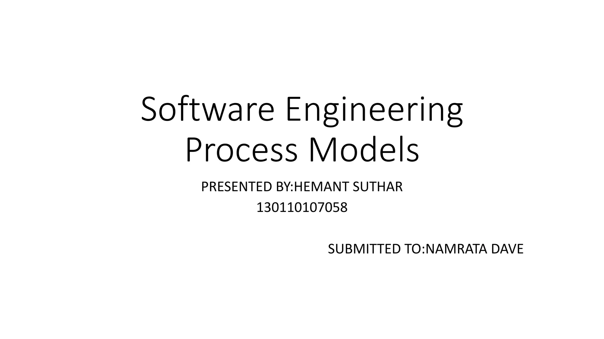 This document discusses software process models and their characteristics. It describes the waterfall model, modified waterfall model, evolutionary models including prototyping and incremental development. The spiral model is also explained as it couples iterative prototyping with controlled sequential development. The models are compared in terms of their advantages like manageability and accommodating changes, and disadvantages such as inability to adapt to iterations or changes in later stages. Key activities in a software process like requirements, development, validation and evolution are outlined.