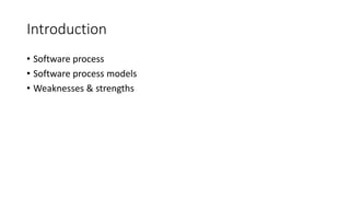 This document discusses software process models and their characteristics. It describes the waterfall model, modified waterfall model, evolutionary models including prototyping and incremental development. The spiral model is also explained as it couples iterative prototyping with controlled sequential development. The models are compared in terms of their advantages like manageability and accommodating changes, and disadvantages such as inability to adapt to iterations or changes in later stages. Key activities in a software process like requirements, development, validation and evolution are outlined.