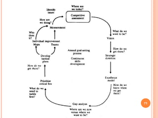 This document provides an overview of total quality management (TQM) principles and philosophies. It discusses definitions of quality, customers, products, and how customer satisfaction is achieved. It also summarizes the philosophies and approaches to quality management advocated by Deming, Juran, Crosby and others. Key process management techniques for middle management are outlined, including process control, improvement and tools like flow charts, check sheets and control charts.