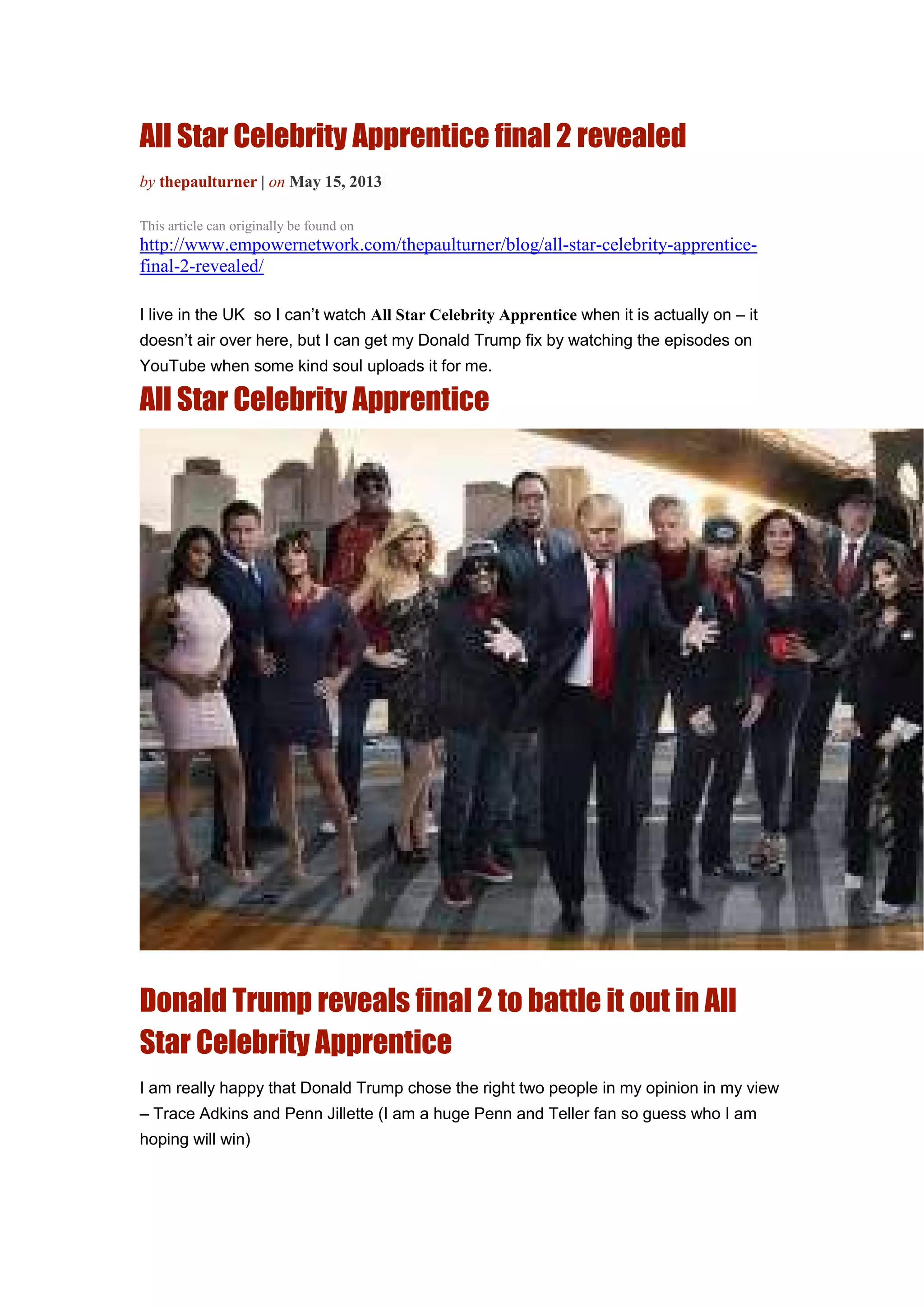 This article discusses the final two contestants revealed on All Star Celebrity Apprentice - country singer Trace Adkins and magician Penn Jillette. The author is happy with Donald Trump's selection for the finalists and is hoping Penn Jillette will win since he is a big fan of Penn and Teller. The author believes people love the show because they enjoy seeing Donald Trump's business strategies and deciding who to eliminate each week, and it's entertaining to try and predict the outcomes of challenges.