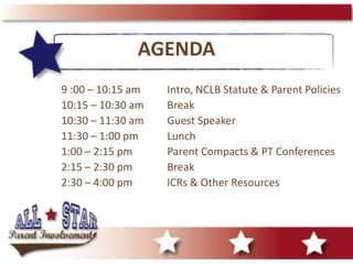 This document outlines the agenda for a November 10, 2009 presentation on parent involvement to the ESC Region XV. The agenda includes introductions and discussions of the NCLB statute and parent policies, a guest speaker, lunch, sessions on parent compacts and conferences, and resources like ICRs. It also provides research on the benefits of parent involvement and key players. Terms like joint development and meaningful involvement are defined. Requirements for district and campus parent involvement policies and school-parent compacts are outlined. The importance of evaluation and compliance are discussed. Additional resources for parent involvement are provided.