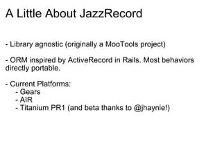 The document introduces JazzRecord, an ORM inspired by ActiveRecord for Rails, which supports various platforms and includes core features such as finders, validation, and associations. It outlines the creation of models, including associated models, and demonstrates methods for finding and manipulating records, as well as implementing validations and callbacks. Additionally, it discusses future developments for JazzRecord, highlighting the need for contributors and the project's ongoing evolution to accommodate asynchronous operations.