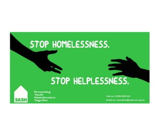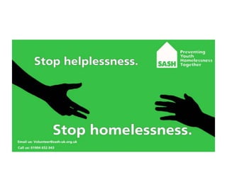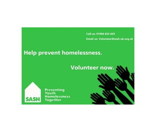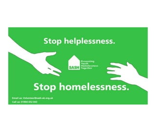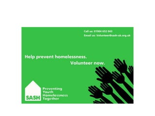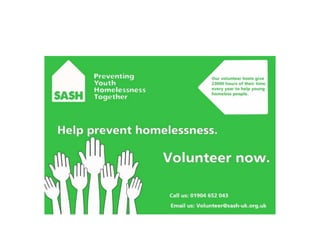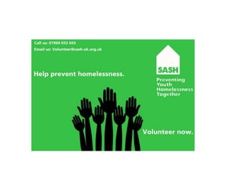 The document provides an evaluation of advertisements created for SASH (Support and Shelter) to encourage volunteering. It discusses various poster, bus advertisement, and sticker designs created by the author. The author aimed to create advertisements that followed a consistent theme and color scheme to be inviting and encourage volunteering. The document reflects on what elements made each design more or less fit for its purpose of attracting volunteers and discusses how the designs could be improved.