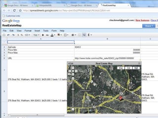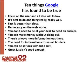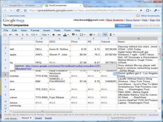 The document discusses key principles and functionalities of Google collaboration tools, emphasizing user focus, speed, and accessibility. It provides checklists and guidelines for utilizing Google Docs, Sheets, Forms, and Sites for educational purposes, including tips for sharing and editing documents. Additionally, it covers the integration of RSS feeds and real-time data features in Google Spreadsheets, enhancing collaborative workflows.