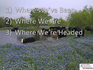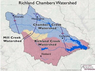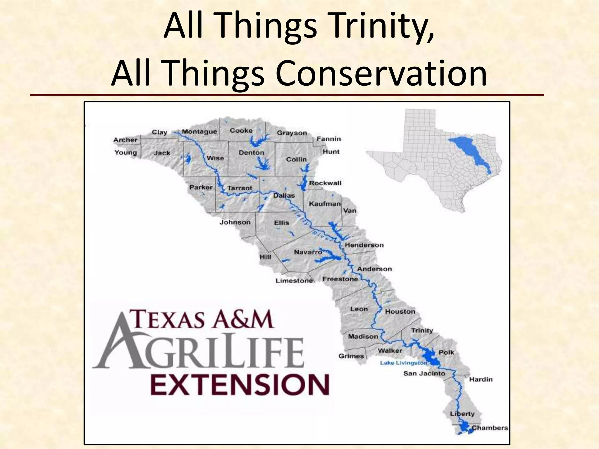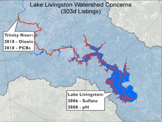 The document discusses the Trinity River in Texas, including its history of pollution, current water quality issues, and efforts through programs like the Trinity River Basin Restoration Initiative to improve habitat, water quality, and connections between rural and urban communities in the watershed through outreach, best management practices, and funding for conservation projects. Key challenges include population growth, habitat loss, and water quality problems from bacteria and other pollutants impairing segments of the river.