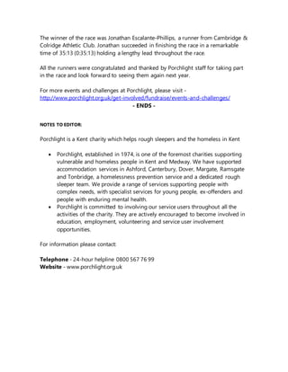 Over 150 runners from across Kent took part in the annual Mount Ephraim 10k run on Sunday August 17th to raise money for Porchlight, a Kent charity helping the homeless. The race started and finished in the beautiful Mount Ephraim Gardens and continued along Kent's scenic countryside. Porchlight is pleased to have raised thousands of pounds in sponsorships and donations from the race to help reduce homelessness in Kent.