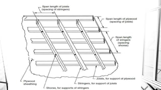 Formwork is temporary structure used to support and contain wet concrete until it hardens. It molds the concrete into the desired shape and controls its position. Formwork materials include lumber, plywood, steel, and plastics. Proper formwork design can significantly reduce construction costs. Formwork accounts for a large portion of the total cost of a concrete structure.
