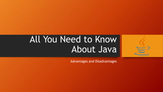 Java is a popular, general-purpose programming language that is widely used for web and mobile (Android) application development as well as big data analytics. It has advantages like a gentle learning curve, being object-oriented, and having powerful development tools. However, it also has disadvantages such as not being as optimized as C++ and having expensive memory management. Overall, Java is worth learning due to its popularity, job opportunities, and versatility across different applications.