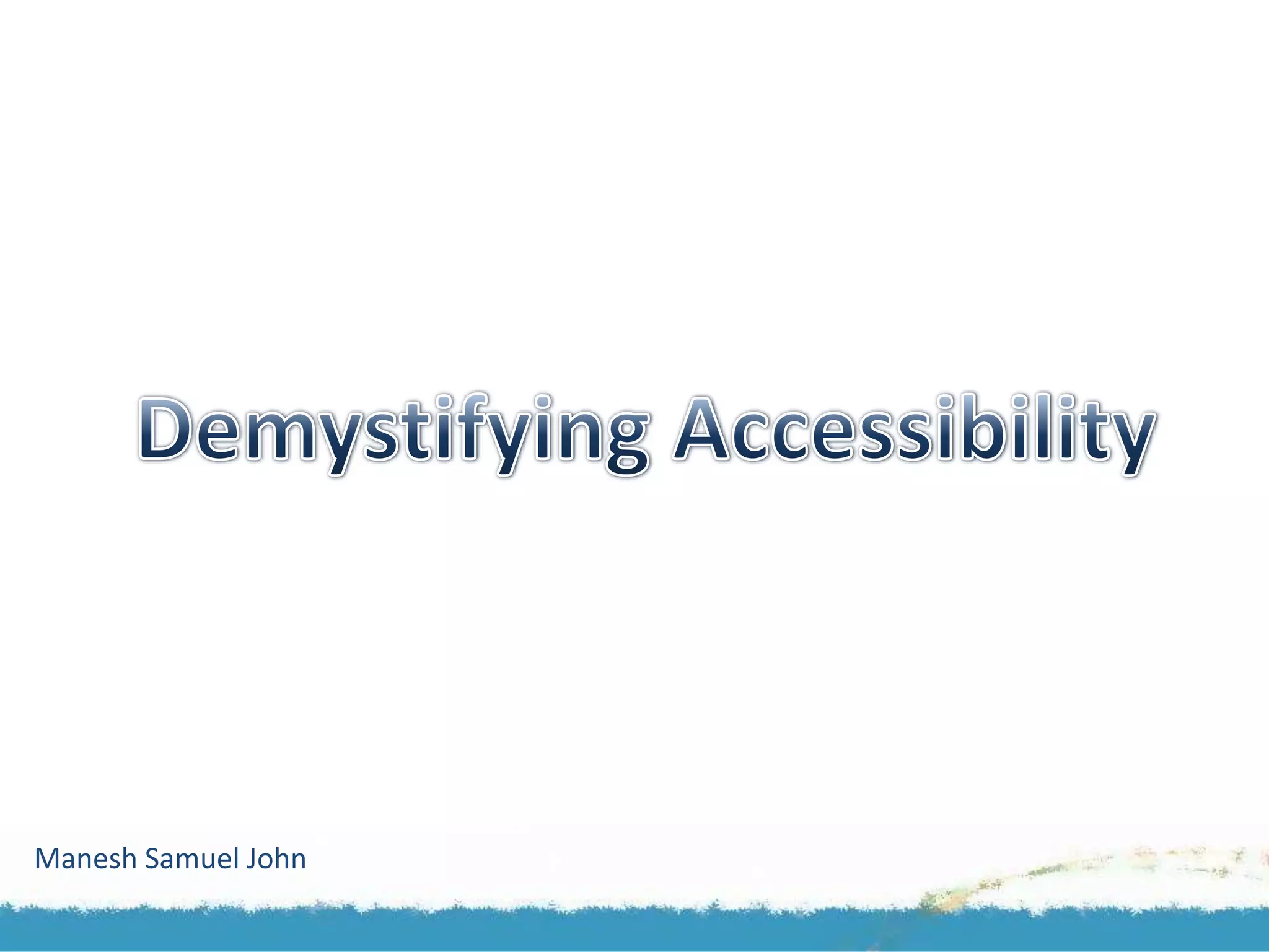 The document discusses the importance of accessibility for everyone, not just those with disabilities. It defines different types of disabilities including visual, hearing, mobility, and learning impairments. It notes that many people experience temporary disabilities as they age. The document emphasizes that web accessibility is important because over 750 million people worldwide have disabilities and people access the web in many ways, including assistive technologies. It provides examples of assistive technologies and regulations around web accessibility. Finally, it offers quick fixes to common web accessibility issues.