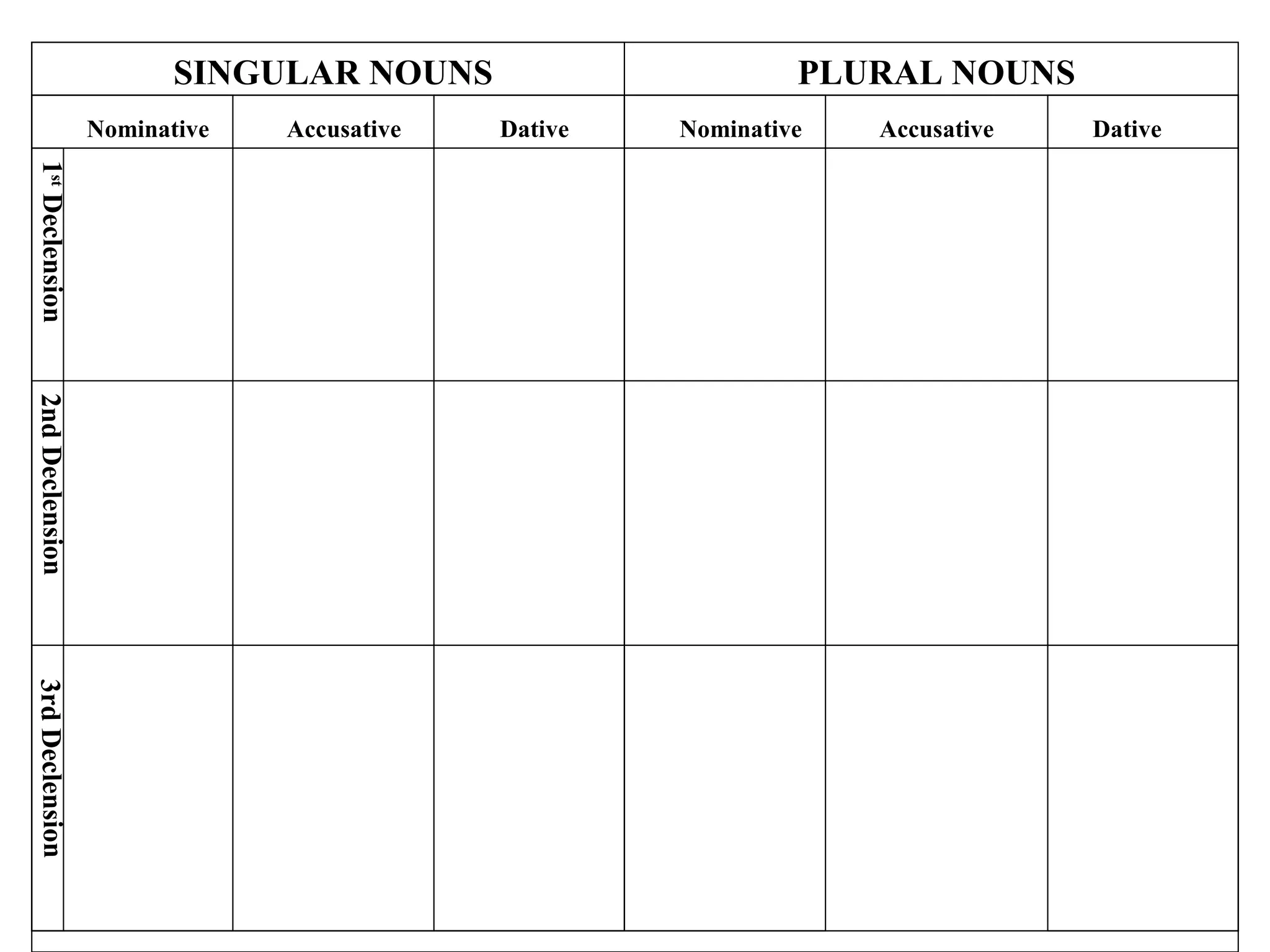 The document shows Latin noun declension charts comparing singular and plural nominative, accusative, and dative cases for the 1st, 2nd, and 3rd declension. Examples are given below the charts demonstrating how different nouns change form depending on their case, number, and gender when used in sentences.