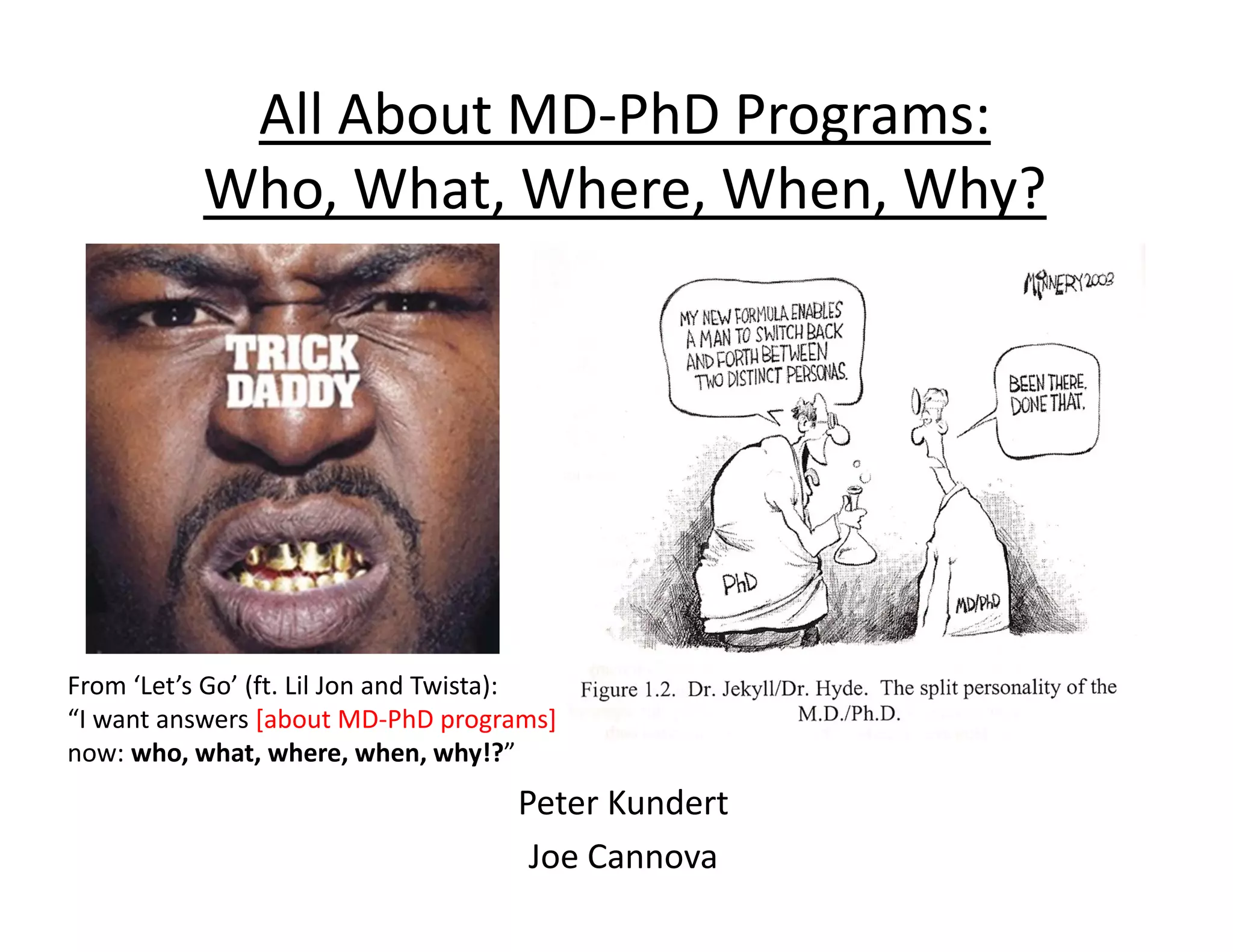 The document provides information about MD-PhD programs, including what an MD-PhD degree entails, the pros and cons of pursuing one, and how to apply. An MD-PhD combines medical school and a PhD program, typically taking 8 years or more to complete. Graduates often work in academic medicine, conducting translational research. Upsides include training for careers at the intersection of research and medicine, but it is a long commitment with transitions between clinical and research phases. Strong research experience is important for competitive applications.