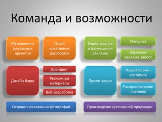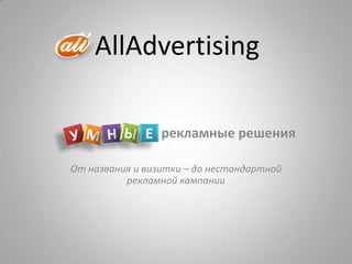 Агентство alladvertising предлагает комплексные рекламные решения, включая разработку названий, фирменного стиля, дизайна упаковки и веб-разработки. Услуги варьируются от создания рекламных материалов до проведения нестандартных акций и брендинга. Оценка стоимости проектов основывается на временных затратах и задействованных специалистах.