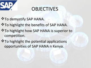 The document discusses SAP HANA and its potential applications in Kenya. SAP HANA is an in-memory database that allows for real-time processing of massive amounts of data. It combines database, data processing, and application capabilities. The document outlines how SAP HANA is faster and more powerful than traditional databases for advanced analytics. It then discusses how industries in Kenya like banking, education, and healthcare could benefit from SAP HANA's real-time analytics capabilities to help with tasks like fraud detection, forecasting, and optimizing operations. The document concludes that SAP HANA presents opportunities for industries and startups in Kenya to gain business insights from their data.