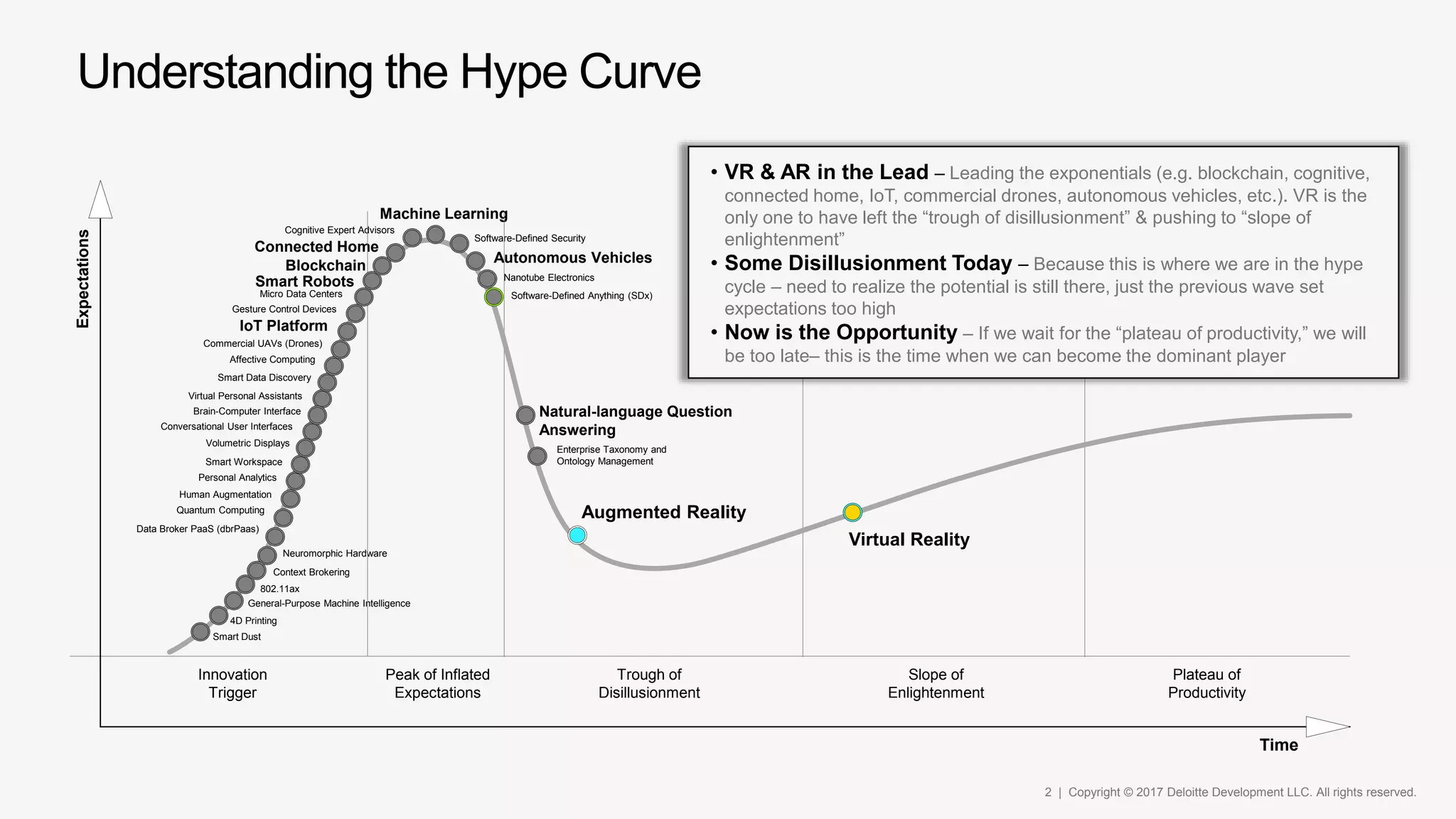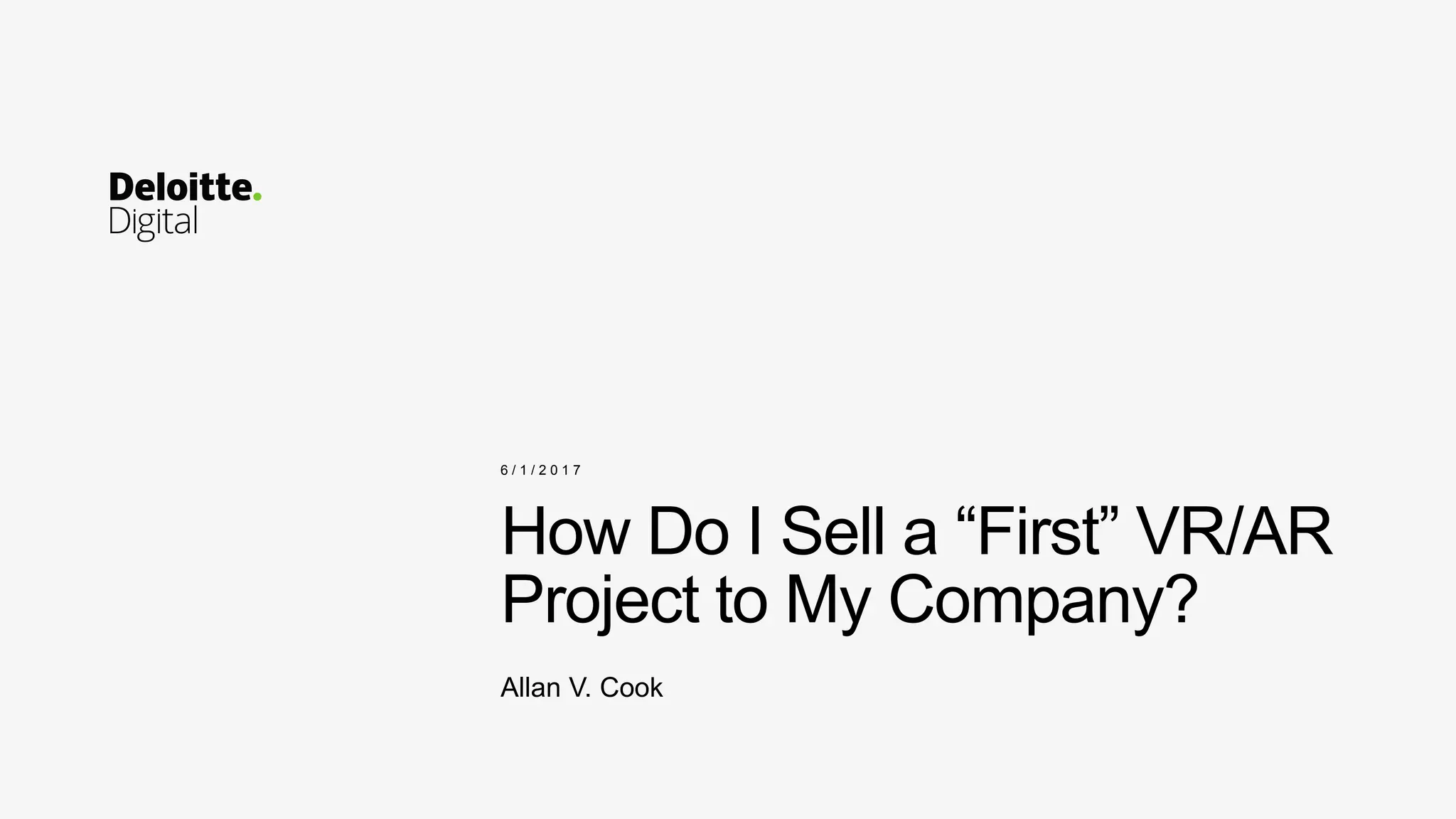 The document outlines strategies for selling a virtual reality (VR) and augmented reality (AR) project within a company, emphasizing the importance of defining a vision, understanding market readiness, and identifying key use cases. It discusses the current state of VR/AR technologies, their potential for growth, and the financial ROI pressures facing executives. Additionally, it details a structured approach to development and implementation, including defining success metrics and creating a roadmap for integration into existing processes.