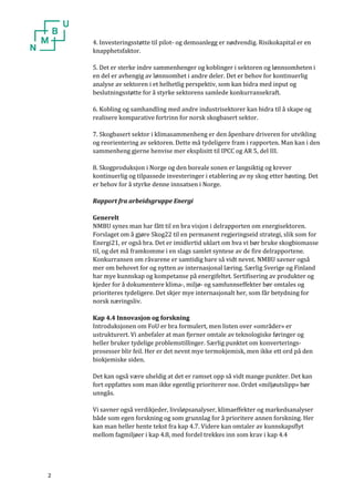 NMBU synes man har fått til en bra visjon i delrapporten om energisektoren. Forslaget om å gjøre Skog22 til en permanent regjeringseid strategi, slik som for Energi21, er også bra. Det er imidlertid uklart om hva vi bør bruke skogbiomasse til, og det må framkomme i en slags samlet syntese av de fire delrapportene. Konkurransen om råvarene er samtidig bare så vidt nevnt. NMBU savner også mer om behovet for og nytten av internasjonal læring. Særlig Sverige og Finland har mye kunnskap og kompetanse på energifeltet. Sertifisering av produkter og kjeder for å dokumentere klima-, miljø- og samfunnseffekter bør omtales og prioriteres tydeligere. Det skjer mye internasjonalt her, som får betydning for norsk næringsliv.