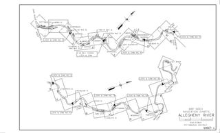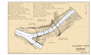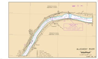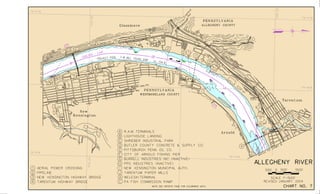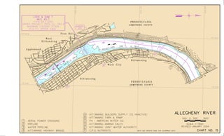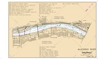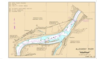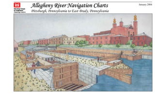 This document contains navigation charts and information for the Allegheny River between Pittsburgh, Pennsylvania and East Brady, Pennsylvania. It provides details on lock hours of operation, regulations for vessel operation, permit requirements, and contact information for navigation questions. The charts depict features like channels, buoys, mile points, and aids to navigation. General notes explain that minimum depths and geographic coordinates are based on historical soundings and aerial photos from 1992-1999.