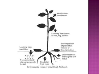 The document discusses allelopathy, which refers to biochemical interactions between plants, including inhibitory or stimulatory effects. It notes that allelopathy involves one living plant species producing chemicals that influence the growth or development of other plants or microorganisms. The document then lists some key points about allelopathy, including: common allelochemicals produced by plants; sites of allelochemical production; mechanisms of action; constraints to using allelopathy for weed management; and practical applications. It provides several examples of allelopathic effects from various plant species.