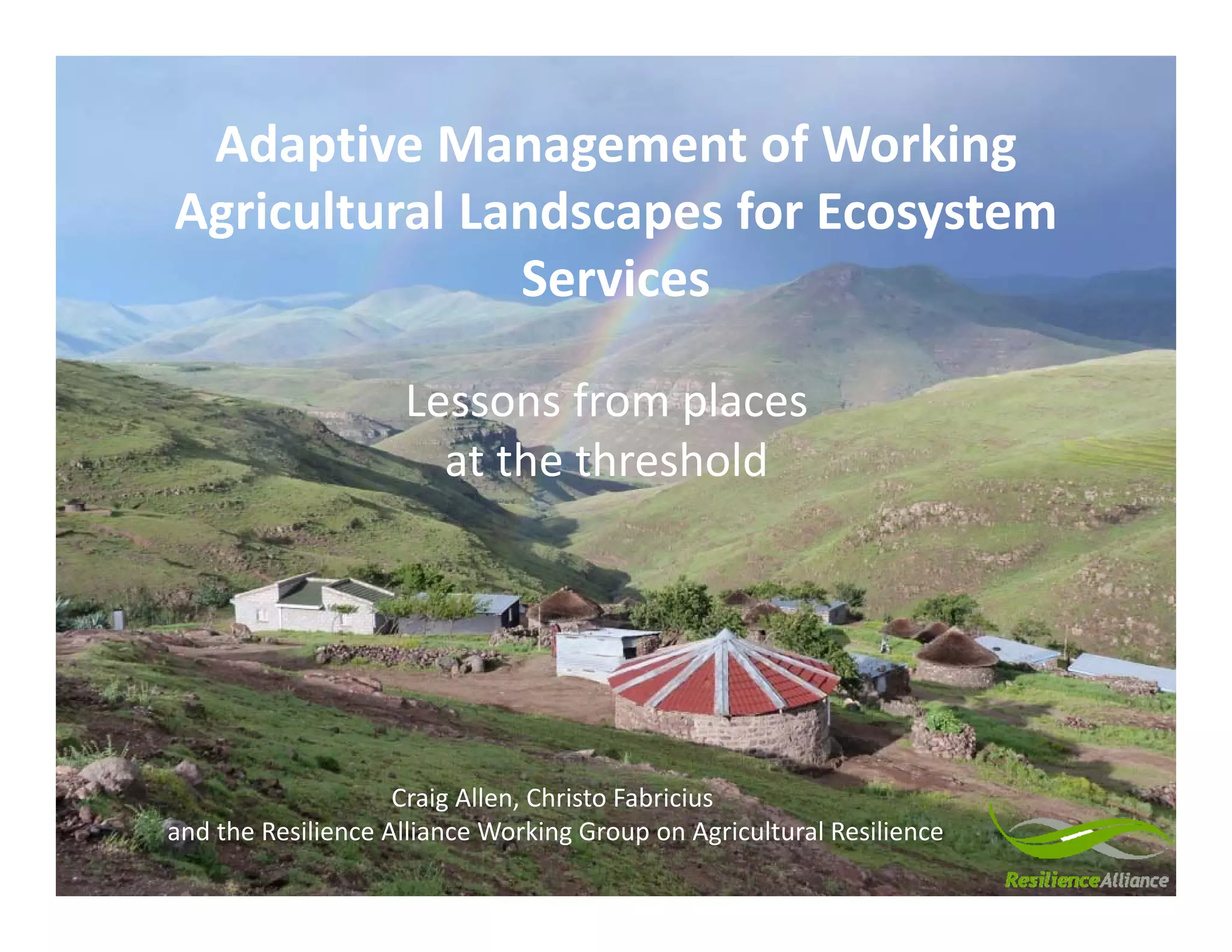 The document discusses the challenges of managing agricultural landscapes in sub-Saharan Africa, highlighting the importance of resilience in coping with disturbances and adapting to changes. It introduces the concept of adaptive management as a method to enhance resilience and transformability in social-ecological systems, particularly in agriculture. The text emphasizes the need to assess trade-offs among ecosystem services and resilience attributes for better governance and sustainability.