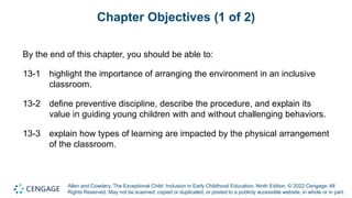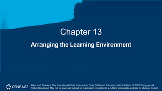 This document discusses arranging the learning environment in inclusive early childhood classrooms. It covers the importance of the physical environment, preventive discipline techniques, and how different types of learning are impacted by classroom arrangements. The chapter objectives are outlined, including highlighting the importance of arrangement, defining preventive discipline, explaining how arrangements impact learning types, and understanding key elements to consider when planning early learning environments. Specific strategies are provided for arranging spaces to promote independence, such as ensuring toilet facilities, cubbies, and sleeping areas are accessible. Teacher-structured activities and discovery learning are also discussed.